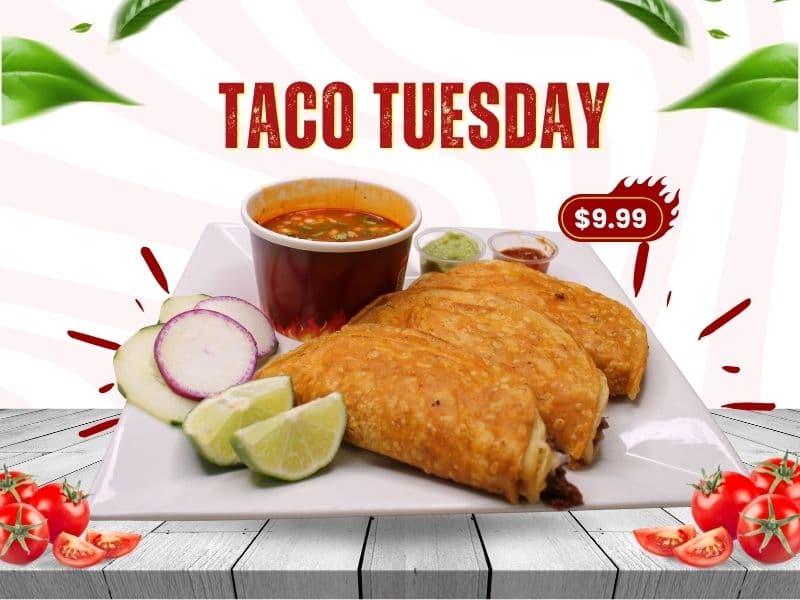 Three birria + broth: Crispy tortillas, stretchy cheese, and hot consommé. The city’s best Tuesday crave—just $9.99.